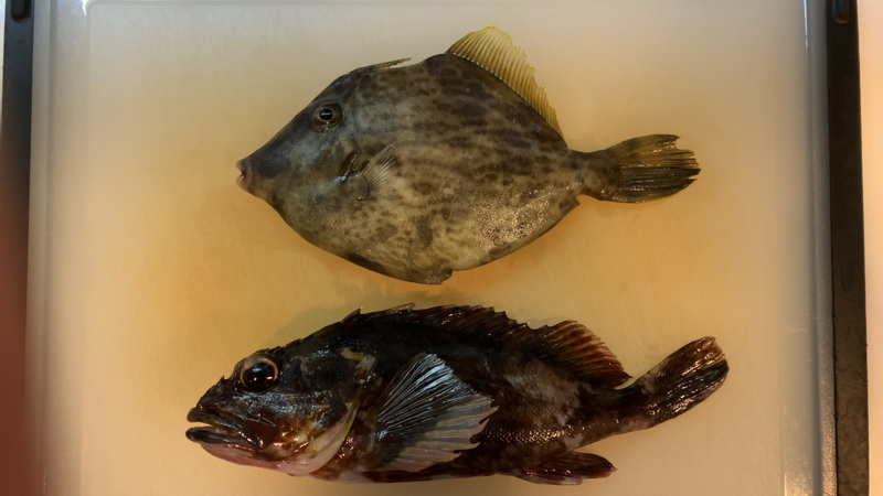 ・ちょい投げでカワハギ、胴付きで良型カサゴをゲット、水温まだまだ高くカミナリベラ成魚?も